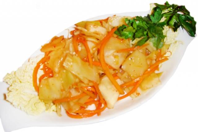 Nuestros platos salados favoritos no se pueden atribuir completamente a la cocina tradicional coreana. Se preparan con cilantro, poco utilizado en la península. Esta variación fue inventada por los coreanos: coreanos deportados del Lejano Oriente a principios del siglo pasado, que se establecieron en los países de la ex Unión Soviética. Simplemente no tuvieron la oportunidad de obtener sus productos habituales, por lo que utilizaron lo que estaba disponible. Repollo en escabeche en coreano, goza de una merecida popularidad entre los amantes de los platos picantes.