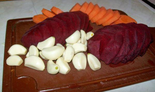 Las zanahorias y las remolachas se cortan en la forma que desee, el ajo se pica con una trituradora. Los pimientos de ambas variedades se cortan en pequeños aros.