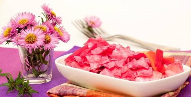 De hecho, las hojas de col, coloreadas con jugo de remolacha, se parecen a los pétalos de alguna flor fantástica. Si está bellamente distribuido en una fuente, este aperitivo puede convertirse en una decoración inimitable de su mesa festiva.