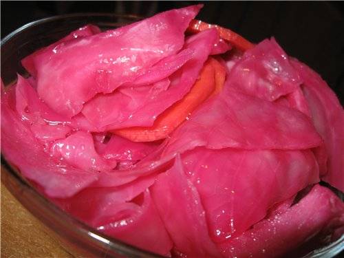 Entre las muchas recetas de col en escabeche con remolacha, me gustaría destacar esta, que tiene su origen en los países mediterráneos y se distingue por un aroma especial, especiado y un sabor único, gracias a los muchos ingredientes interesantes que se utilizan en ella. Los fanáticos de todo lo inusual definitivamente deberían probarlo, especialmente porque es bastante fácil encontrar todos los ingredientes para ello.