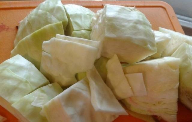 La cabeza de repollo cosechada se libera de las hojas superiores y se corta en dos, tres o incluso cuatro partes, de modo que luego sea conveniente cortar el área del muñón. Luego, cada trozo de repollo se corta en 5-6 trozos en porciones.