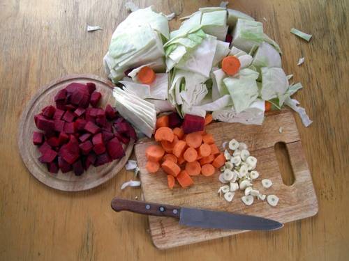Pero al hacer repollo en escabeche a diario, el tamaño del corte y su método no importa, además, las cabezas pequeñas de repollo a menudo se cortan en solo 6-8 partes. Y las zanahorias y las remolachas a menudo se cortan en rodajas finas.