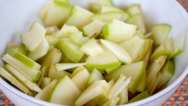 - Las manzanas (12 piezas) se cortan en varios trozos y se les quita el corazón. Las partes resultantes se cortan en trozos finos.