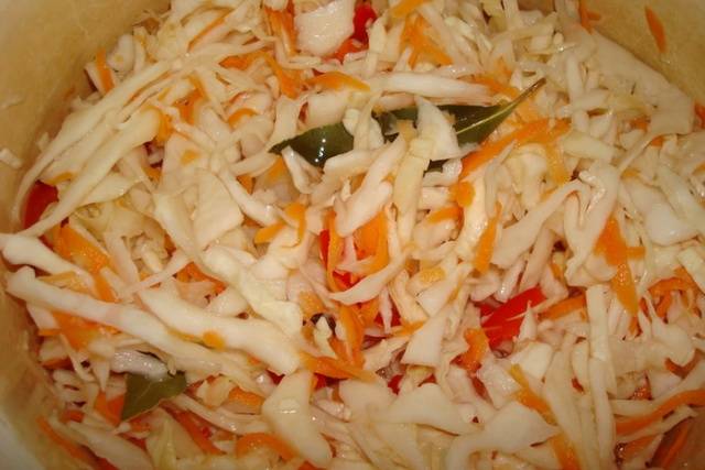 El método estándar de recolección de repollo para el invierno, además del componente principal, implica el uso de zanahorias. Se agregan dientes de ajo y especias a la masa vegetal al gusto.
