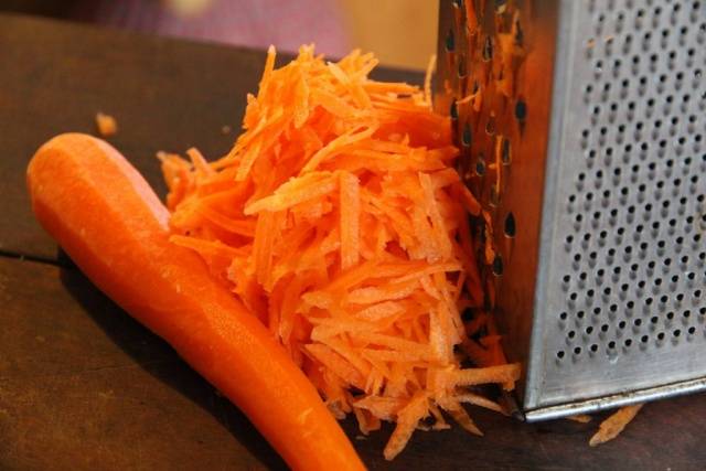 - Luego comienzan a cortar zanahorias. El uso de un rallador o electrodomésticos especiales ayudará a acelerar este proceso. Para la receta, debe tomar dos zanahorias con un peso total de aproximadamente 0,4 kg.