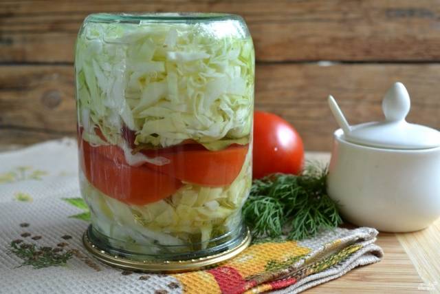 Las primeras variedades de repollo se conservan en vinagre en frascos con tomates. Para tales preparaciones, se necesitan tomates maduros con una piel densa.
