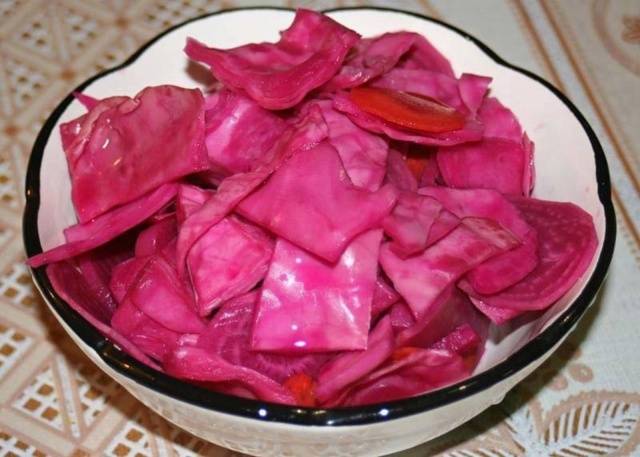 El repollo temprano se conserva en vinagre junto con la remolacha. Este aperitivo tiene un sabor dulce y un rico color burdeos.