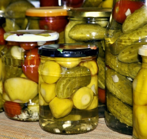 Es mejor almacenar una variedad de colores de calabaza en escabeche, pepinos y tomates para el invierno en el sótano y servir con papas hervidas, carne o pescado.