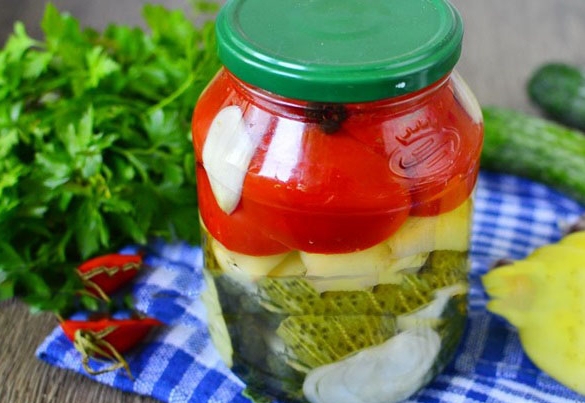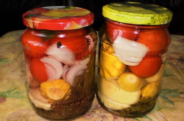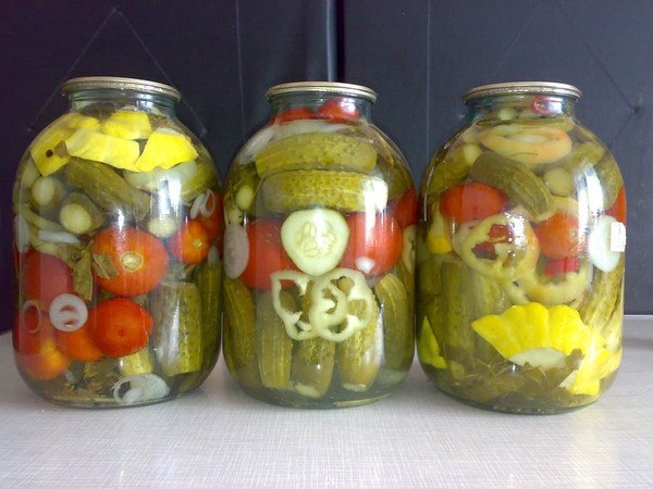 Incluso una joven ama de casa puede preparar calabazas brillantes en frascos con la adición de tomates y pepinos para el invierno. Los tomates se mantienen enteros y jugosos, mientras que los pepinos crujen muy bien con las comidas.