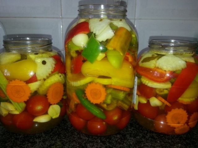 Las verduras variadas, sujetas a todas las reglas de esterilización y decapado, se almacenan bien durante todo el invierno debido al uso de conservantes. Una vez que las latas se hayan enfriado, deben trasladarse a un lugar oscuro y fresco: un sótano o un sótano. En un apartamento, es mejor almacenar alimentos variados en la despensa. Si la tapa está hinchada y la salmuera se vuelve turbia, no se recomienda abrir y consumir verduras.