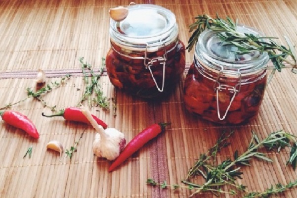 - Coloque la masa resultante en un frasco estéril, llénelo con tomates y agregue las especias que desee.