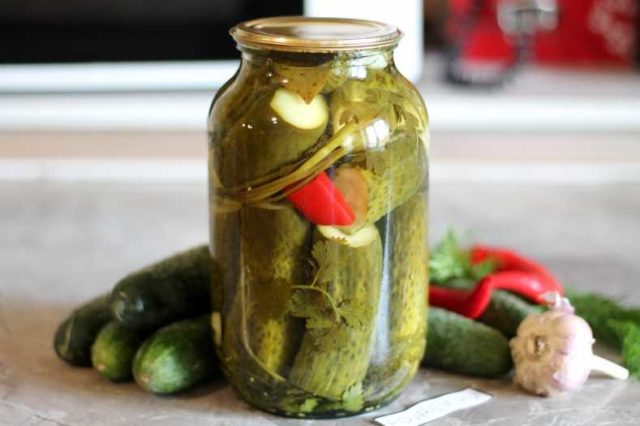 Los pepinos búlgaros en frascos de un litro se pueden encurtir para el invierno con la receta a continuación.