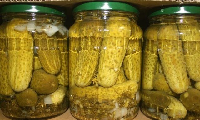- Para la pieza de trabajo, puede tomar contenedores de cualquier volumen. Muy a menudo, los pepinos búlgaros se conservan en vinagre para el invierno en frascos de 1 litro.