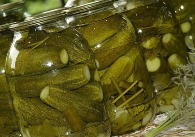 El fondo de la lata está cubierto de vegetación. Después de eso, los pepinos se apisonan allí con fuerza y se vierten con agua hirviendo. Cuando se enfría, se vierte en una sartén esmaltada, añadiéndole sal, azúcar y ácido cítrico. Tan pronto como el líquido hierva, se vierten los pepinos. Las latas se enrollan inmediatamente y se guardan en un lugar fresco.