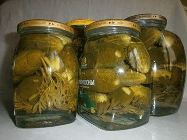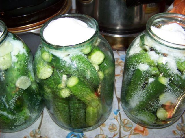 El agua de los pepinos se prende fuego, se sazona con sal, azúcar y vinagre. Tan pronto como la marinada comienza a hervir, se vierten pepinos sobre ellos hasta el borde de los frascos. Se enrollan con tapas y se envían a un lugar fresco y oscuro.
