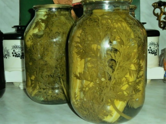 Una característica distintiva de esta receta es que no es necesario hervir las verduras por primera vez.En cambio, se sumergen en agua fría en un recipiente durante 10 a 12 horas. Después, se colocan en frascos junto con las hierbas y se vierten con una marinada hirviendo cocida de sal, pimienta, esencias y especias. Los bancos se esterilizan en agua hirviendo durante 30 a 40 minutos, luego se sellan y se envían para su almacenamiento.