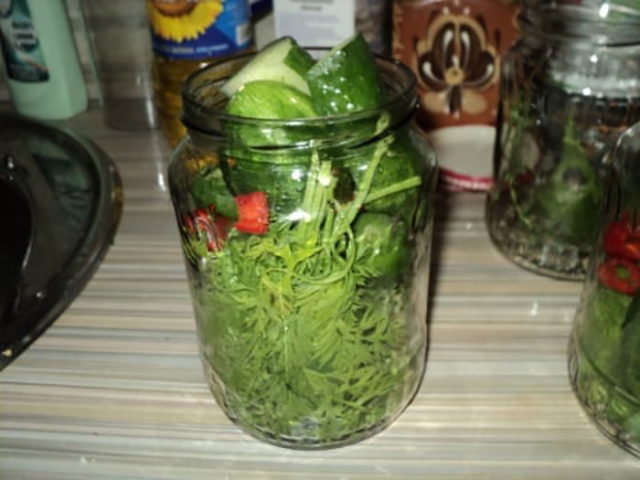 Se lavan los pepinos y se quitan las colas. El pimiento se corta por la mitad, se seleccionan las semillas y luego se trituran en rodajas. Las verduras se colocan en frascos junto con las hierbas, se vierten con salmuera hirviendo de vinagre, azúcar y sal. Cada recipiente se sella con una tapa y se retira para su posterior almacenamiento durante el invierno.