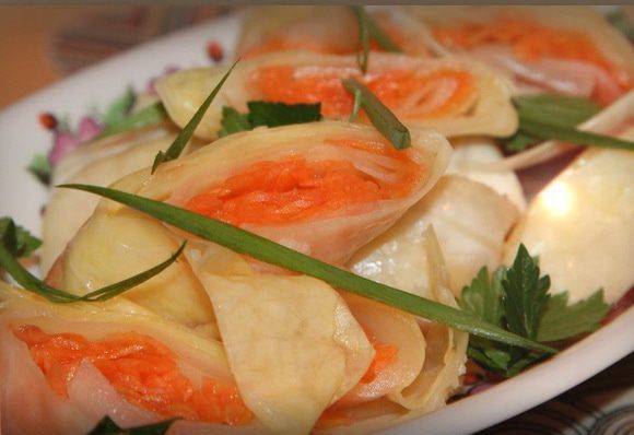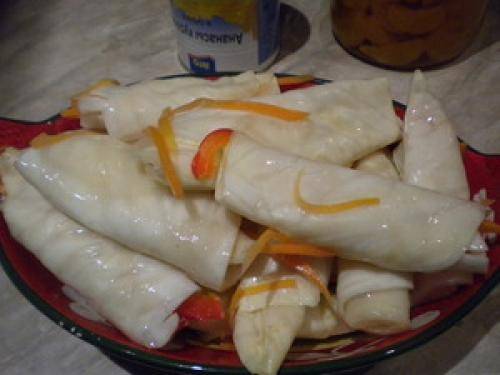 El repollo en escabeche con pimientos picantes a menudo se prepara en forma de panecillos, que agregan belleza y originalidad adicionales al plato.