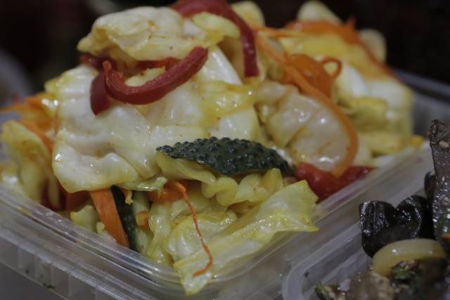 Poner la mezcla de verduras con repollo en un frasco de vidrio y verter con la marinada tibia.