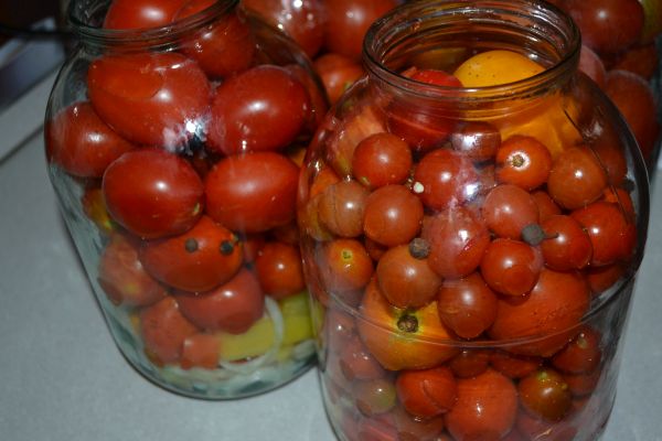 Llena los frascos con tomates. Ponga pimiento en los huecos resultantes. Verter agua caliente sobre todo y dejar actuar un cuarto de hora. Repite esto dos veces. Escurre la primera agua en una cacerola. Es necesario para hacer la marinada. Vierta sal y azúcar en él. Vierta vinagre unos minutos antes de hervir.