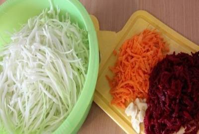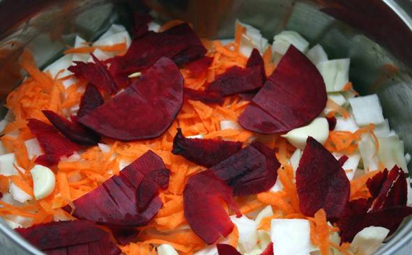 - Según la receta, el repollo se corta en trozos de 2x3 cm, las zanahorias se cortan en rodajas. Remolacha y ajo - en rodajas finas.