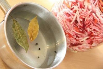 - Ponemos las verduras en capas en un frasco esterilizado. Su volumen depende de su elección, aunque los frascos pequeños siempre son más convenientes. La capa inferior es repollo, luego zanahorias, remolachas y ajo. Ponga una hoja de laurel en la parte superior y, si lo desea, pimienta de Jamaica con guisantes o cilantro.3
