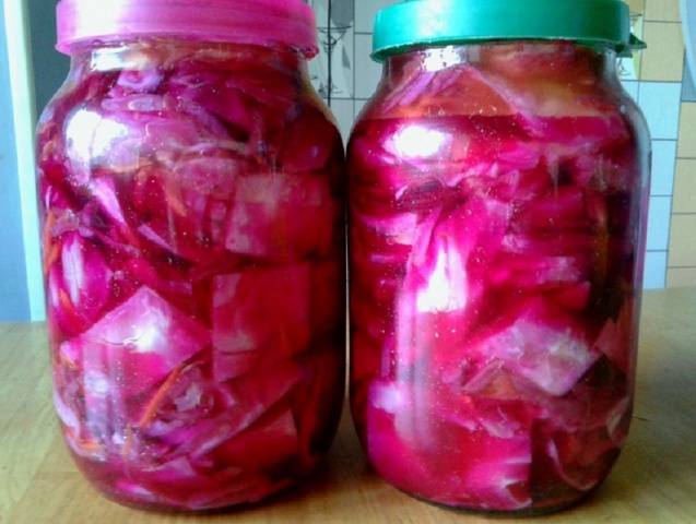 Enrolle las tapas y retire el repollo en escabeche con remolacha para guardarlo. Está lista en 2 días, por lo que puede abrir un frasco para tomar una muestra.