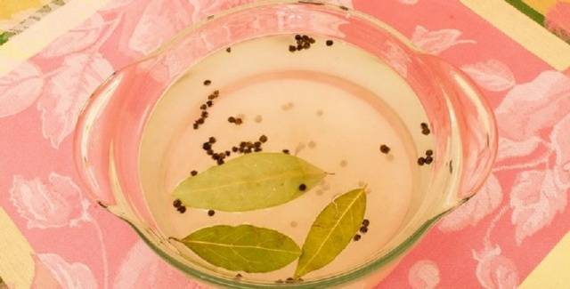 Luego retire el pimiento y la hoja de laurel con una espumadera y agregue vinagre a la marinada.