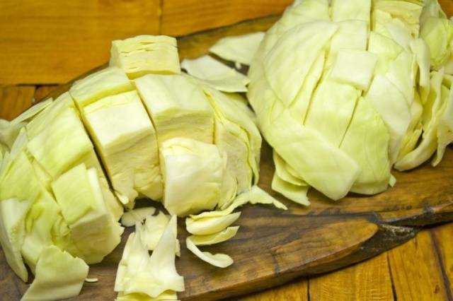 - Cortamos el repollo de acuerdo con la receta de encurtido sin vinagre en damas. Cómo hacerlo de manera más conveniente: primero cortamos el repollo en tiras largas de no más de 5 cm de ancho, y luego dividimos cada una de ellas en cuadrados.