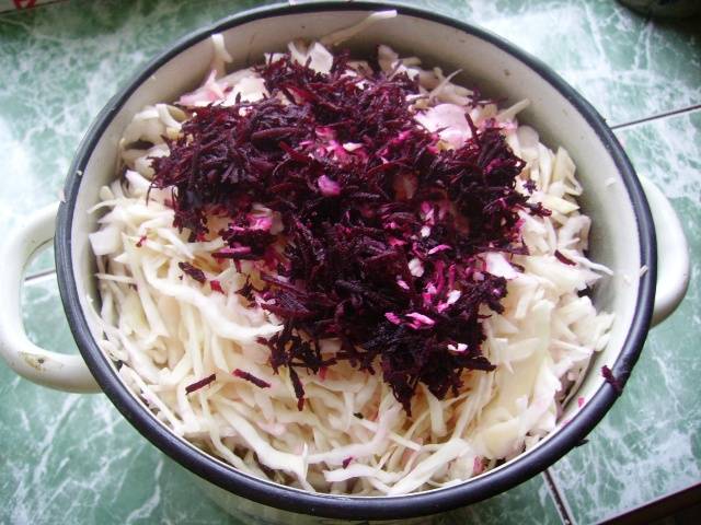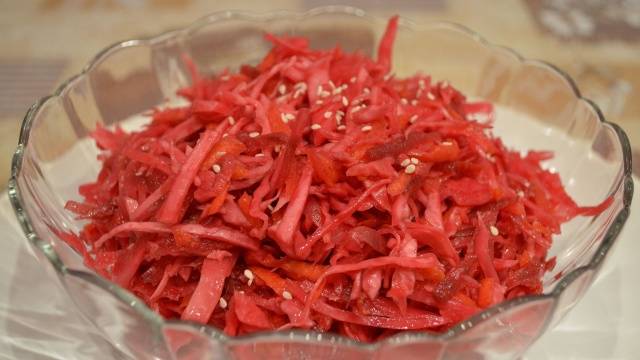 - Las remolachas deben pelarse y rallarse en un rallador especial para cocinar zanahorias al estilo coreano. Por lo tanto, el repollo tendrá aproximadamente el mismo grosor que la remolacha y no será visible en la ensalada terminada.