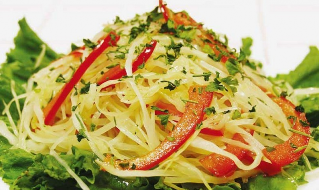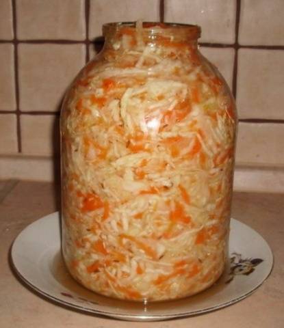 Es este tipo de ensalada de repollo el más útil, ya que el proceso de su preparación se basa en la fermentación, como resultado de lo cual se libera ácido láctico y se activan las propiedades beneficiosas del producto. Gracias a la marinada, no es necesario triturar las verduras para obtener jugo. Esto acelera el proceso de cocción y evita que el repollo se vuelva suave y viscoso.