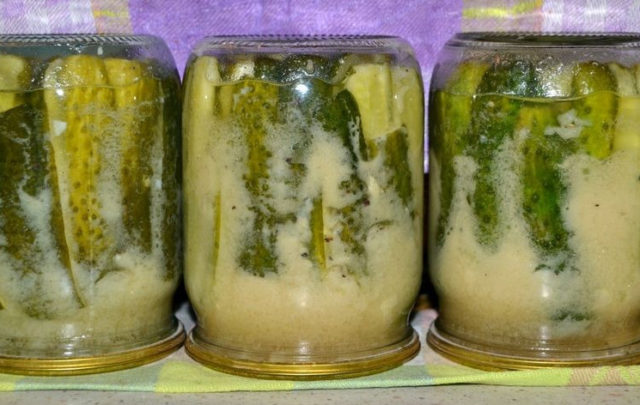 - Coloque el ajo en el fondo del frasco, luego ponga los pepinos y vierta la mezcla preparada sobre ellos.
