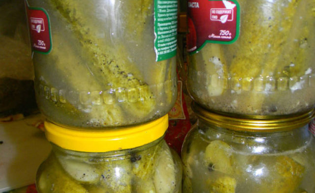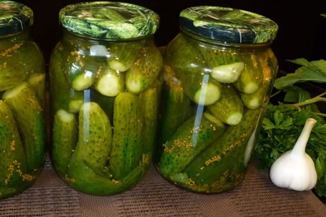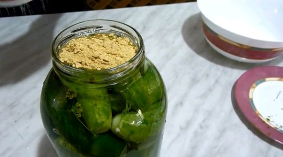 Pepinos para el invierno bajo relleno de mostaza sin vinagre.