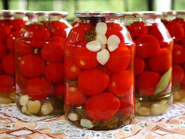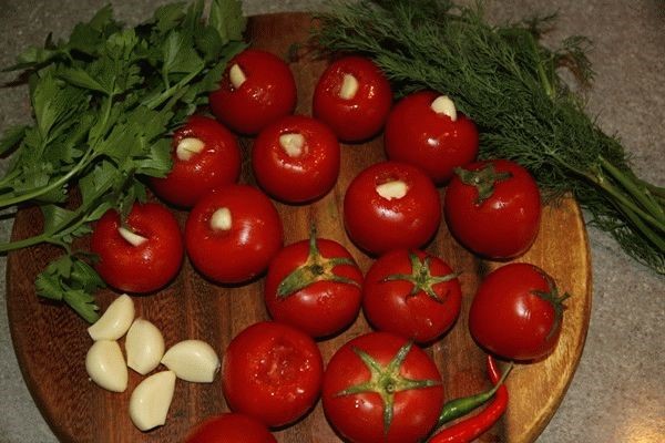 Los tomates en escabeche con ajo también se pueden preparar de diversas formas. Aquí está uno de los más simples, sin el uso de ingredientes adicionales, sin embargo, si se desea, se pueden agregar para cambiar el sabor.