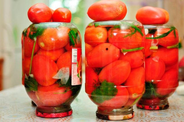 - Los tomates se colocan en un frasco y se vierten con agua hirviendo simple. Deje reposar diez minutos. Lleve la marinada a ebullición, vierta vinagre en ella.