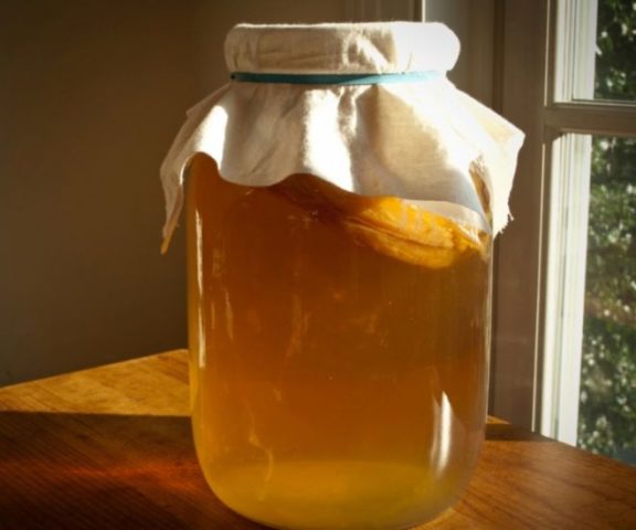 - la bebida de té se endulza ligeramente a razón de 100 g de azúcar por 1 litro de bebida, y luego se deja crecer el hongo, cubriendo el cuello del frasco con una gasa;