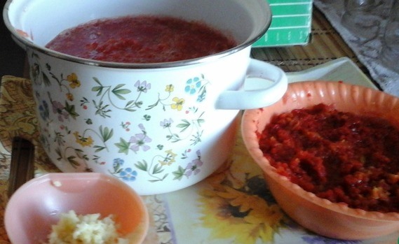 - Los tomates se desplazan a través de una picadora de carne, la pimienta también se corta en tiras.