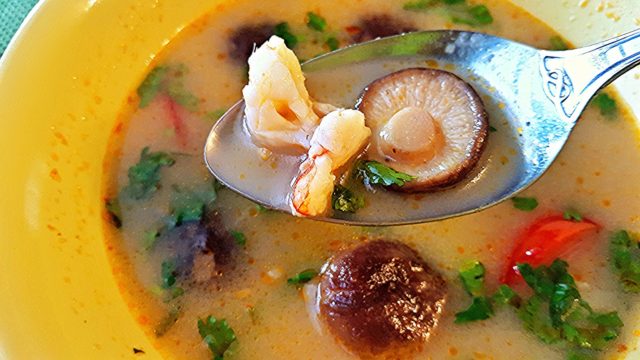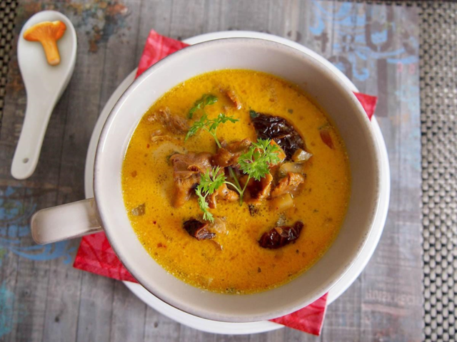 Sopa de champiñones con rebozuelos y gambas congeladas