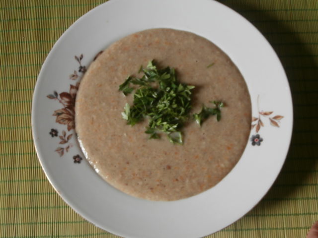 - Moler la mezcla guisada en una licuadora, diluyendo un poco con agua hasta obtener la consistencia de una crema agria baja en grasa.
