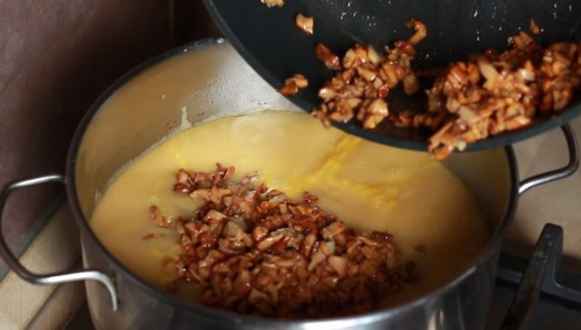 - Freír los champiñones, agregar la crema, la cebolla, guisar durante 5 minutos.