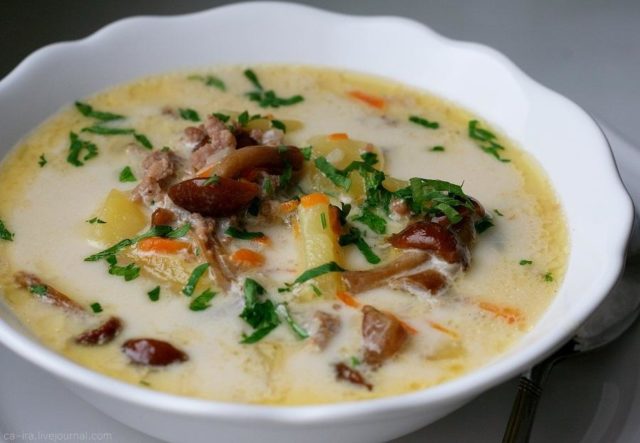 No es necesario cocinar un pollo entero para sopa de queso con agáricos de miel; de acuerdo con esta receta, puede usar carne picada.