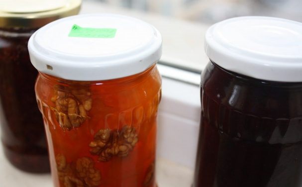 El proceso de elaboración de la mermelada se diferencia del utilizado en la receta anterior solo en que se añaden nueces picadas con un cuchillo junto con orejones, limón y especias. Si no se supone que la mermelada se use como relleno, entonces las nueces no se pueden picar mucho y poner en mitades o cuartos.