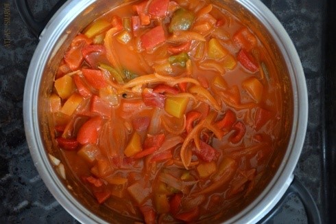 El método de cocción es similar al utilizado en la receta anterior, solo se agregan pimientos picantes picados 5 minutos antes del final del guiso, junto con vinagre.
