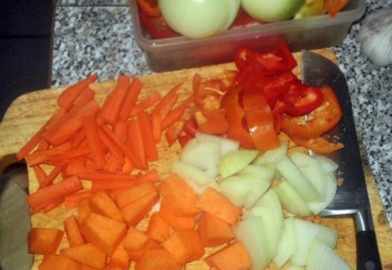- Agregue las zanahorias a una cebolla ligeramente dorada, después de 10 minutos los pimientos dulces, y luego del mismo tiempo, agregue los tomates.