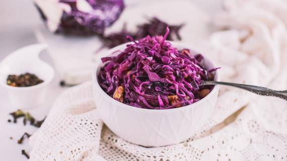 Esta deliciosa col está hecha de variedades blancas y se pone roja debido a la presencia de remolacha en la receta.