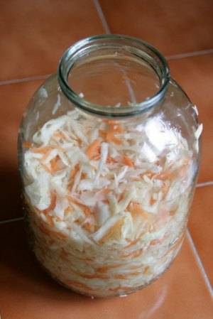 Solo se requiere una zanahoria por media cabeza de repollo. Triture la col no muy finamente, agregue zanahorias ralladas. No es necesario triturarlo ni molerlo. Transferimos verduras a un frasco. Deben llenarlo hasta la mitad. Ponemos una hoja de repollo encima, la llenamos con agua hervida o filtrada, instalamos la carga.