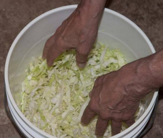 Ponga el repollo y las zanahorias picadas en un bol. En él necesitas sal y mezclar verduras. Remueve con las manos hasta que el jugo comience a resaltar. Ahora transferimos la "ensalada" al cubo de decapado en capas. También compactamos bien cada capa hasta que se suelte el jugo. Las capas en el cubo se intercalan con aditivos (si es necesario): arándanos, semillas de eneldo, arándanos rojos. Entonces, continuamos hasta que el cubo esté lleno. Cubra la parte superior del balde con hojas de repollo limpias, que se quitaron de las cabezas antes de triturar.
