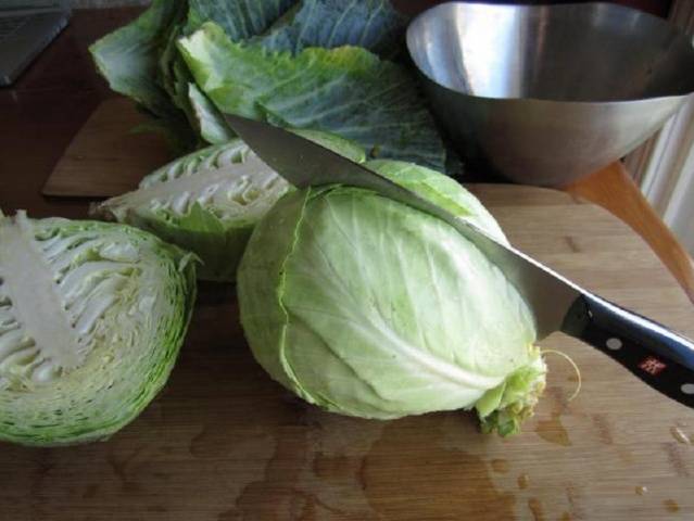 Libere los tenedores de repollo de las hojas verdes superiores y los tocones. Es mejor cortar la cabeza de repollo por la mitad o en 4 partes.
