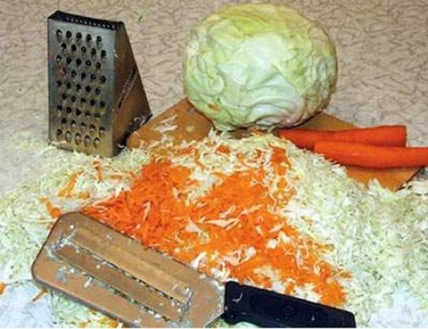 Depende del tamaño de la col. Triture el repollo con un cuchillo picador o con un chef común. Si nunca ha trabajado con una picadora, tenga mucho cuidado. No se deben lograr tiras demasiado estrechas, tal repollo rara vez está crujiente.