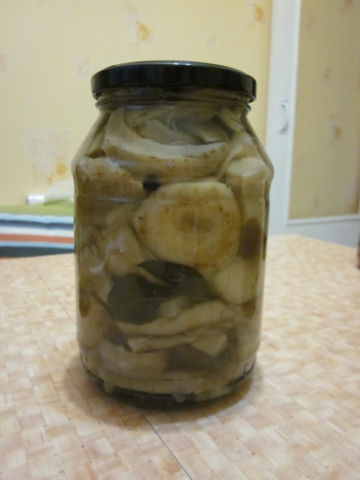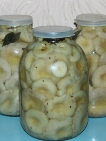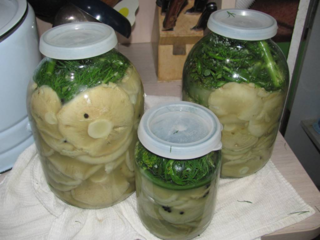 Hervir los champiñones en agua con sal. Enjuague en un colador. Vierta 2 litros de agua en otra cacerola, agregue sal y otras especias. Cocine durante ¼ de hora. Agregue vinagre después de 10 minutos. Coloque las tapas en frascos, vierta la salmuera preparada, enrolle debajo de las tapas de hierro.